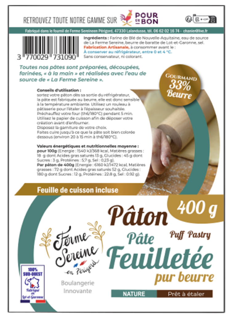 J’ai eu à cœur de développer une activité qui allie tradition et passion : la fabrication artisanale de produits boulangers et pâtissiers à la ferme ! Chez La Ferme Sereine, nous proposons une large gamme de délices faits main, dont des pâtes à tarte prêtes à cuire (feuilletée, brisée, sablée, et pâte à pizza), mais aussi des spécialités régionales telles que les tourtières aux pommes, le pain artisanal, les canelés, et une sélection de viennoiseries pur beurre.